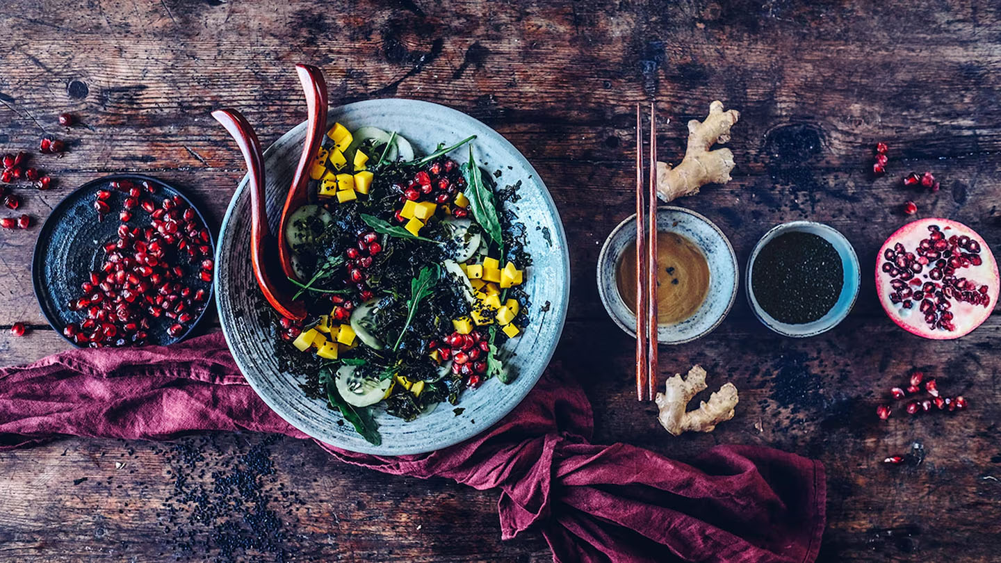 Ausgefallen und superlecker: Unser Rezept für einen fruchtig-scharfen Algensalat mit Granatapfel, Mango, Gurke und einem Dressing aus Sojasoße, Zitronenabrieb, Sesamöl und Ahornsirup.