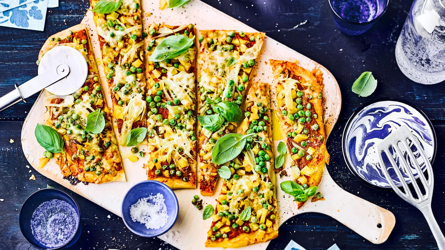 - Den Backofen auf 220 Grad Ober-/Unterhitze (Umluft 200 Grad) vorheizen. Backblech einfetten. Den Teig auf einer leicht bemehlten Arbeitsfläche oval ausrollen und auf das Blech legen. Mit dem Tomatensugo bestreichen. Das Gemüse gleichmäßig darauf verteilen, salzen und pfeffern. Den Fontina Käse über die Pizza streuen. Im Backofen etwa 25 Minuten backen.