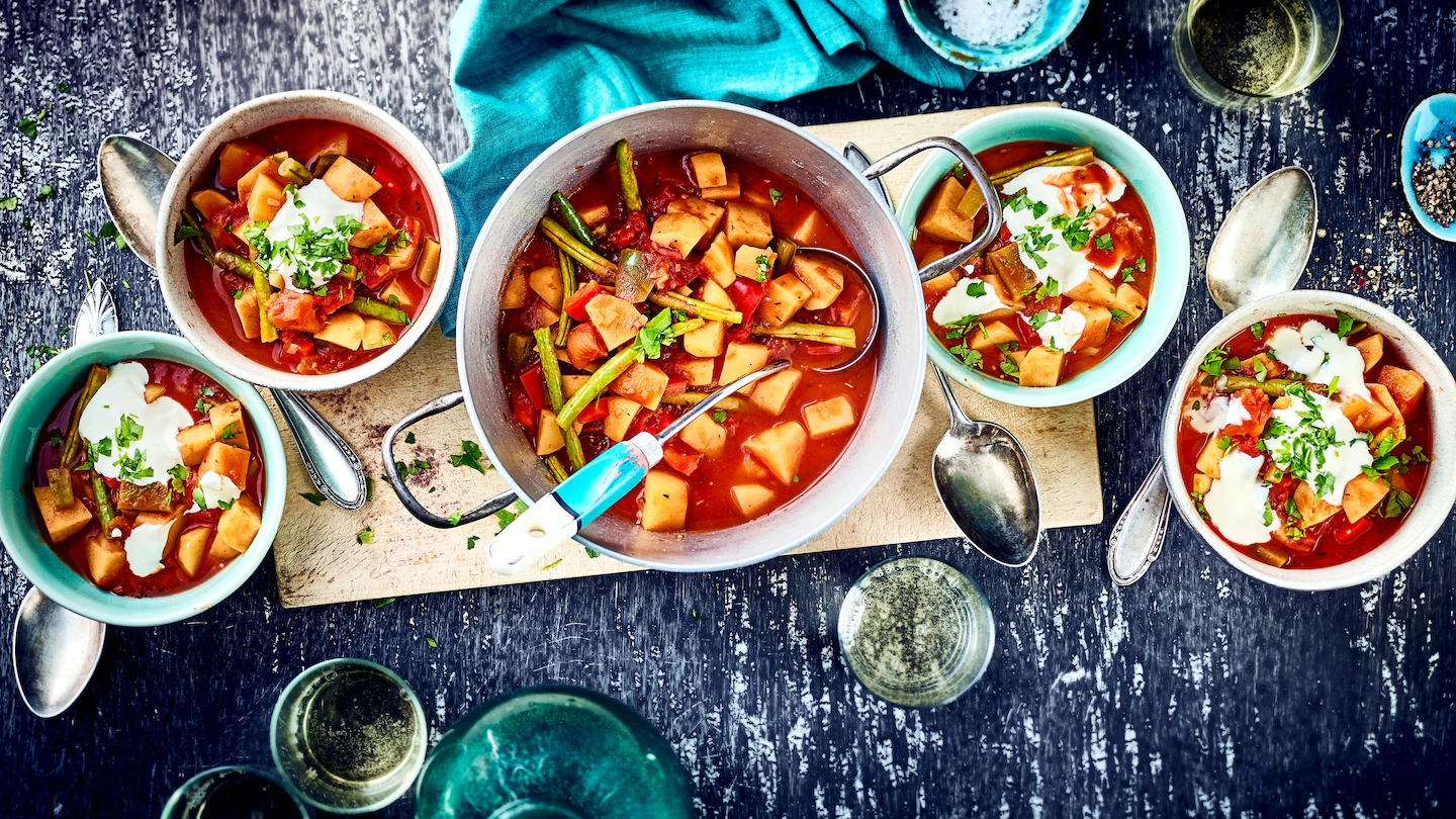 Aus dem geliebten Sahnegulasch wird eine aromatische Variante mit Tomaten, Paprika und viel Gewürz. Der klassische Eintopf bekommt mehr mediterrane Vibes mit Gemüse, frischen Kräutern und einem guten Öl statt Mehlschwitze. Kartoffelsalat kommt nicht mehr ertränkt in Mayo, sondern mit Brühe, Senf und einem Spritzer Zitrone. Und der Kuchen? Bleibt. Aber saftiger – mit Nüssen, Datteln oder Joghurt im Teig. Weniger Zucker, mehr Geschmack.
