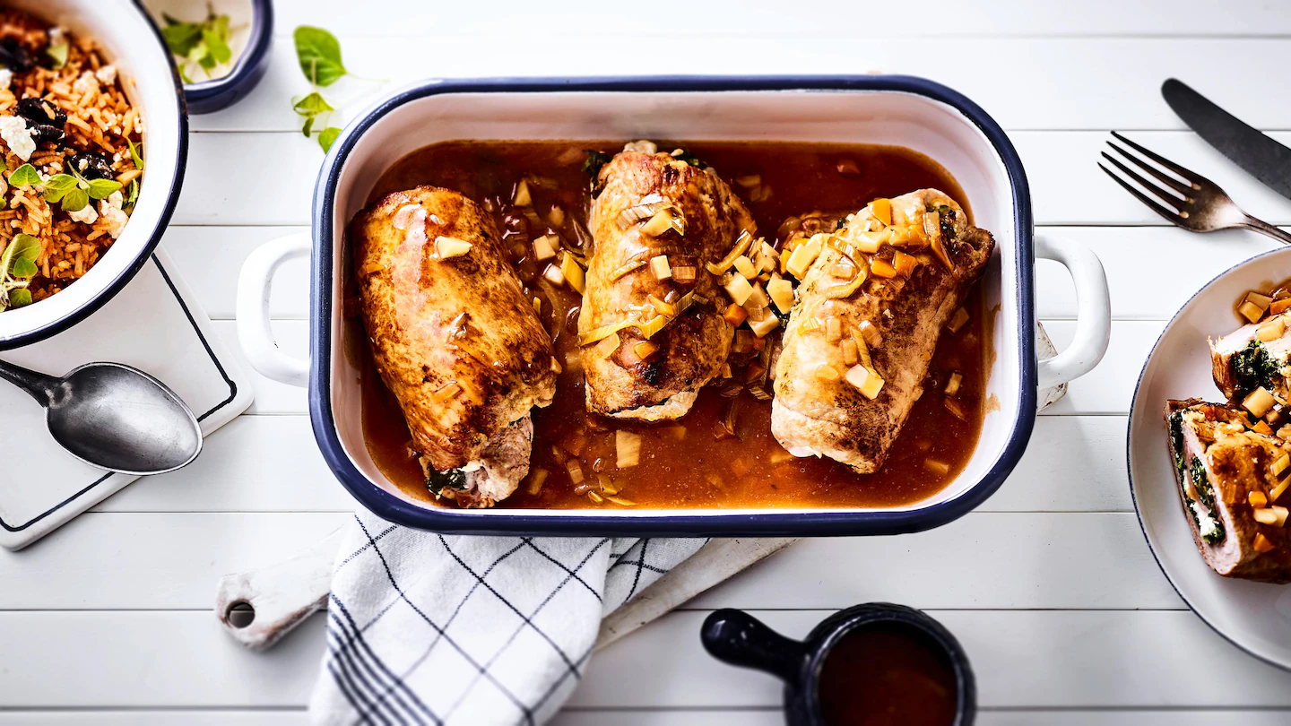 - Zuerst mit den Schinkenscheiben, dann mit den aufgetauten und trockengetupften Spinatblättern, belegen. Zum Schluss den zerbröckelten Feta gleichmäßig auf dem Fleisch verteilen, dabei ringsum einen schmalen Rand freilassen. An den Seiten leicht einschlagen und aufrollen. Die Rouladen mit Küchengarn binden.