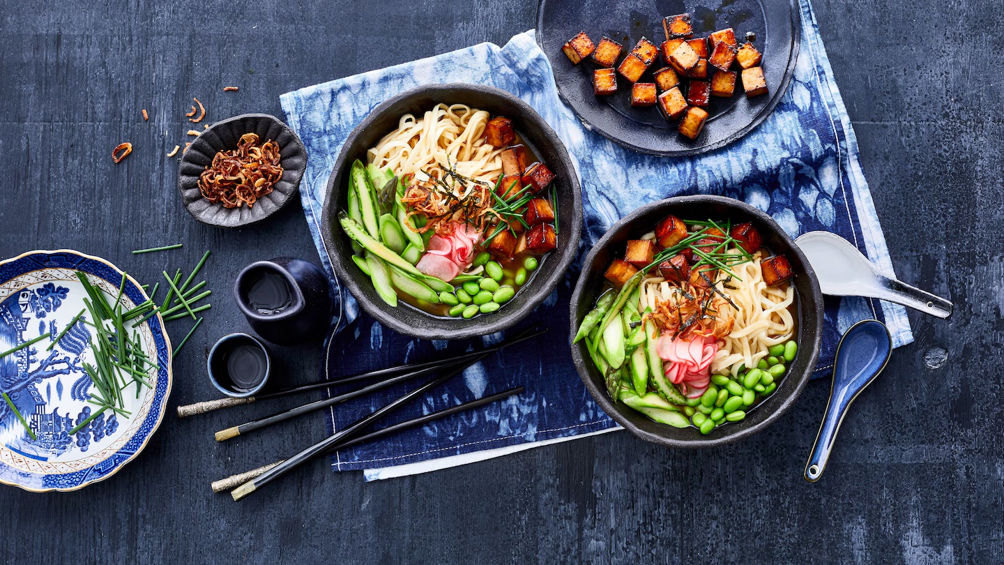 - Die Gemüsebrühe aufkochen. Miso-Tare auf 4 Schalen verteilen und mit dem heißen Fond aufgießen. Nudeln, Edamame und Spargel in die Schalen geben. Mit den abgetropften Radieschen anrichten. Mit Röstzwiebeln und Nori bestreut servieren.