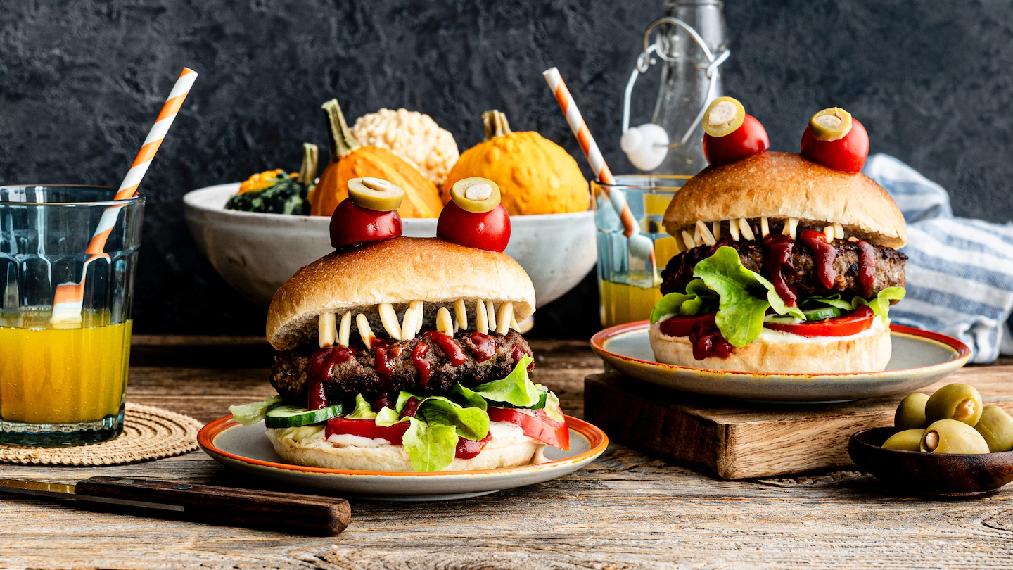 - Die unteren Brötchenhälften mit Mayonnaise bestreichen. Salatblätter, Tomaten- und Gurkenscheiben darauf legen, leicht salzen und pfeffern. Je einen Burger darauf setzen und etwas Tomatenketchup als „Blutkleckse“ auf die Burger verteilen.