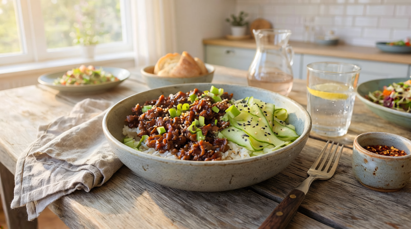 - Reis in Schüsseln geben, Hackfleisch darauf anrichten und mit Sesam, Frühlingszwiebeln und den Gurkenscheiben toppen.