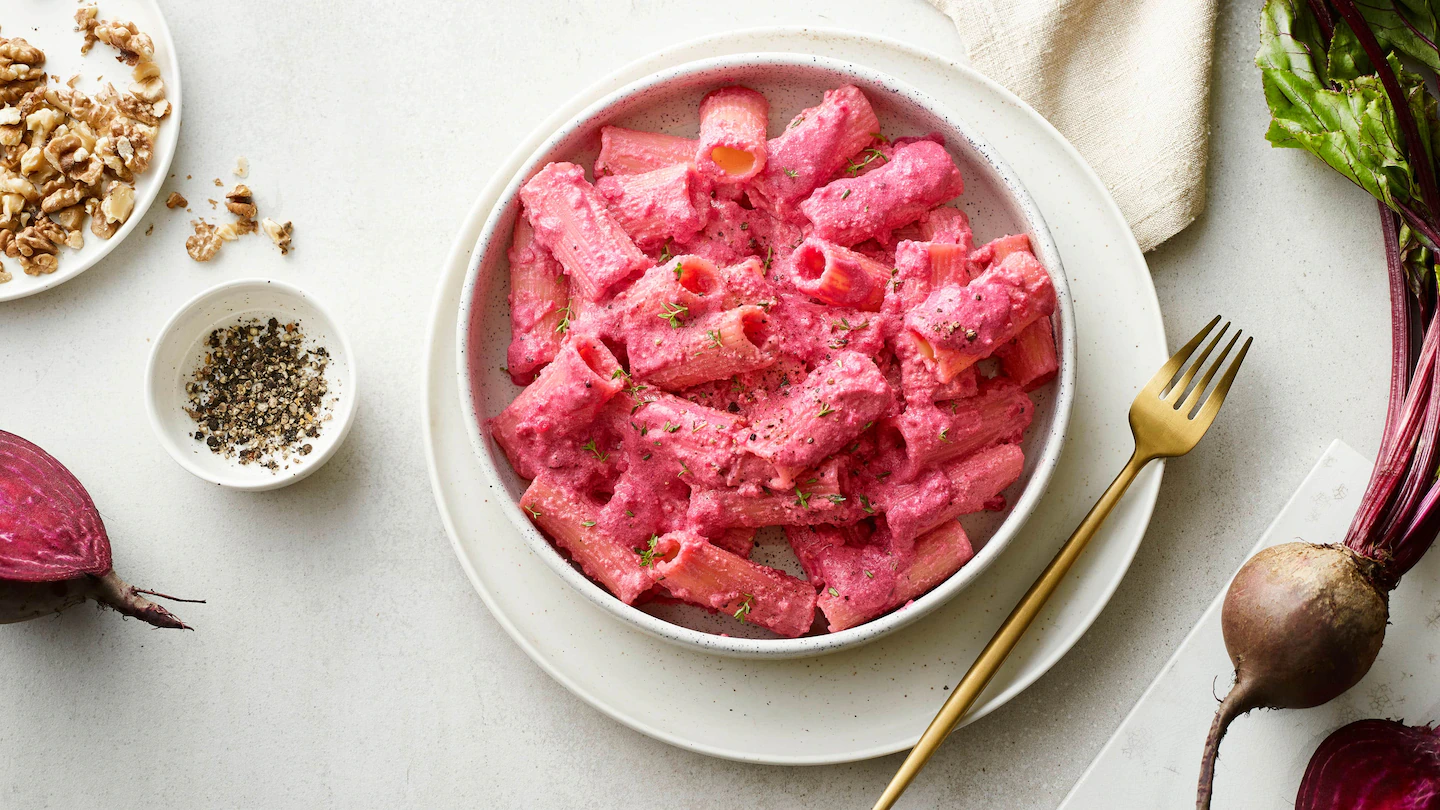 - Pink Pasta mit Rucola und Walnüssen anrichten und servieren.