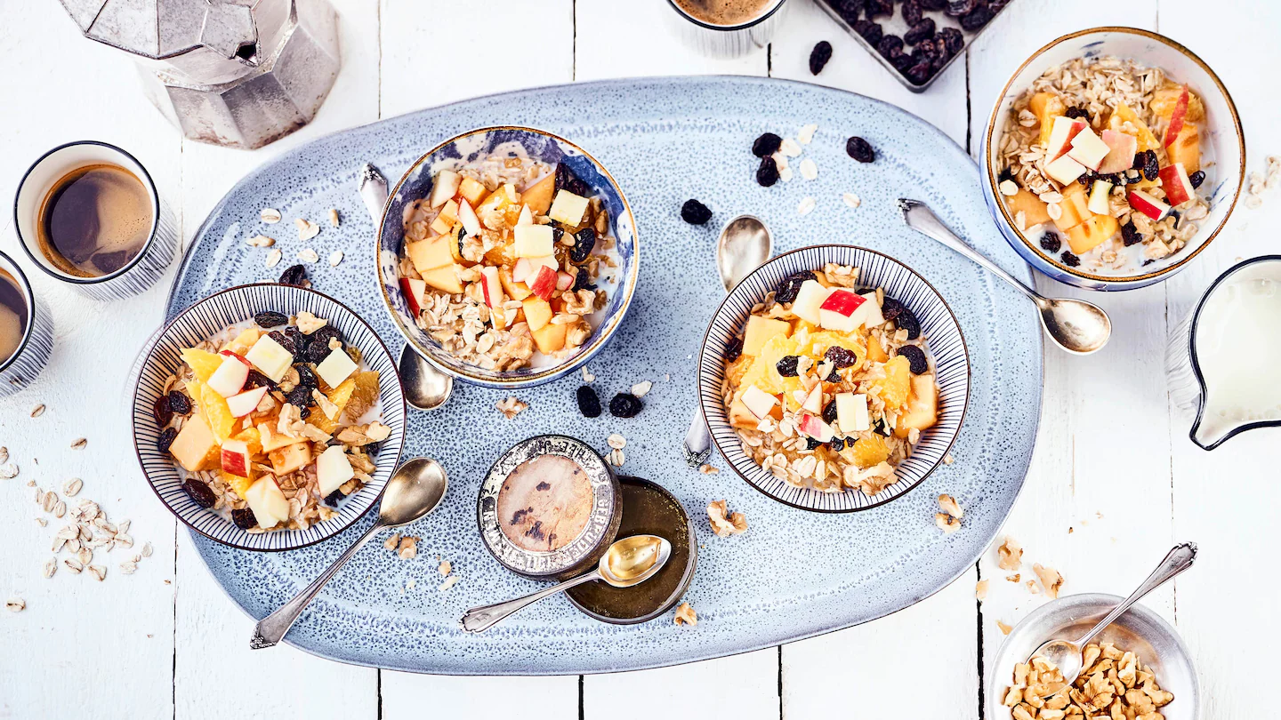 - Das vorbereitete Obst mit den Nüssen und den Sultaninen in vier Müslischalen verteilen. Orangensaft und Honig zugeben und alles mischen. Danach die Haferflocken in den Schüsseln verteilen, untermischen, die Milch zugießen und servieren.
