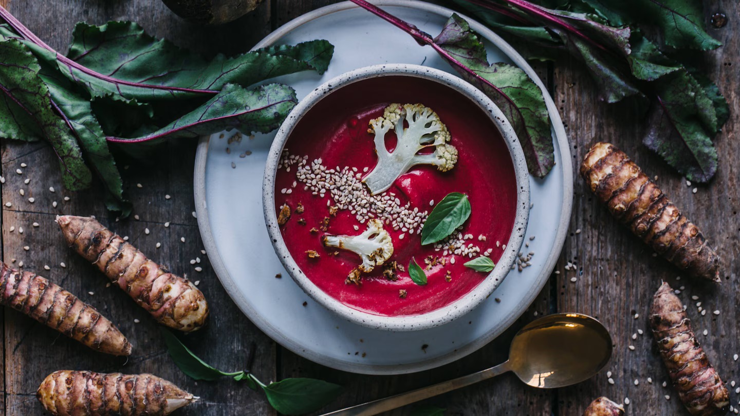 - Rote Bete und Topinambur gar kochen (ca. 20-25 Minuten). Muskat hinzufügen.