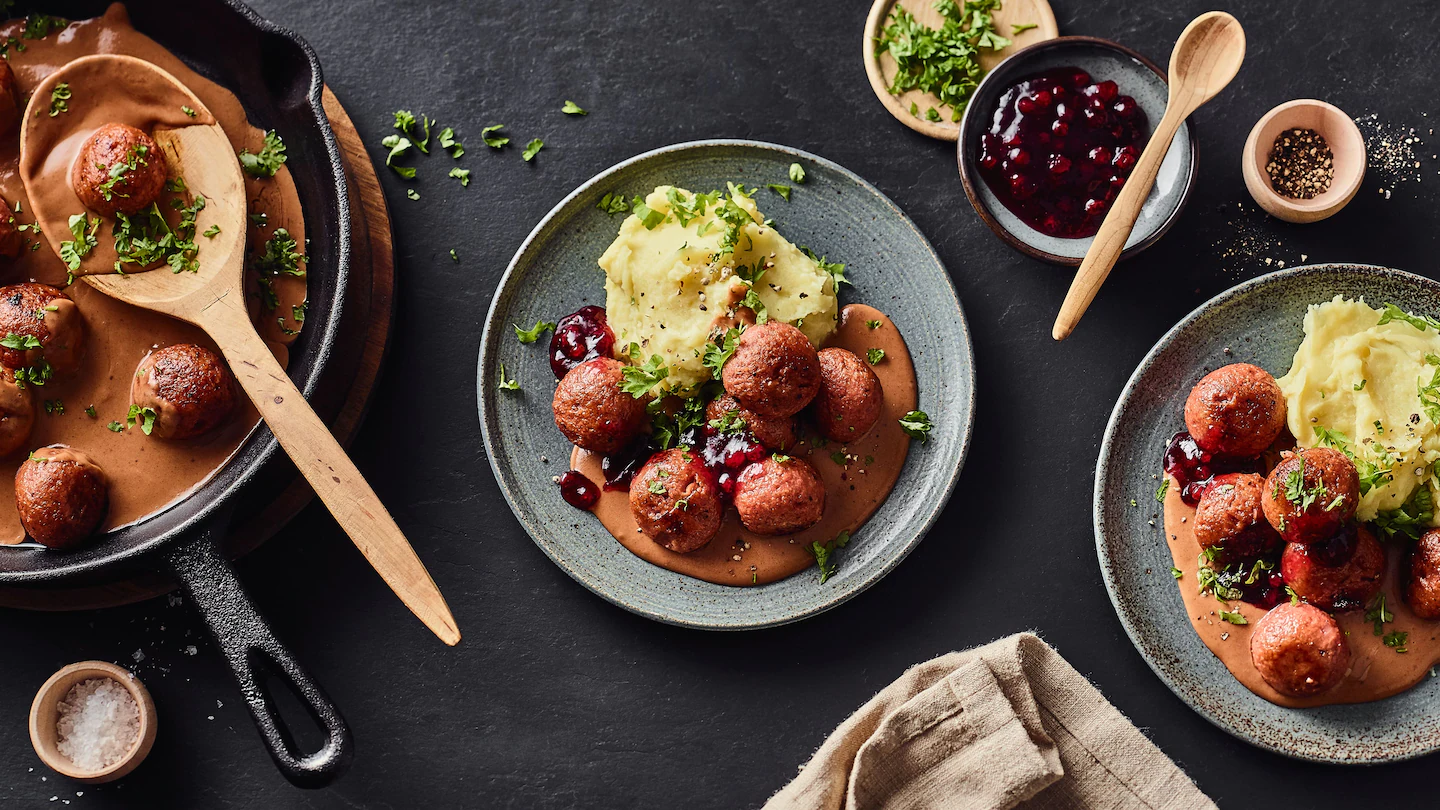- Vegane Köttbullar mit Preiselbeeren garniert servieren. Dazu passt Kartoffelstampf.